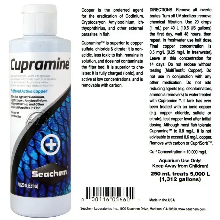 Cupramine effectively eradicates Oodinium, Cryptocaryon, Amyloodinium, Ichthyophthirius, and other ectoparasites of both freshwater and marine fish. It is superior to copper sulfate, chloride & citrate: it is non-acidic, less toxic to fish, remains in solution, and does not contaminate the filter bed. It is superior to chelates: it is fully charged (ionic), active at low concentrations, and is removable with carbon. Sizes: 100 mL, 250 Ml Why It’s Different There is more than a four-fold concentration gap between the minimal therapeutic dose (0.2 mg/L) and the toxic dose (0.8 mg/L). Cupramine is easily removable with chemical filtration. It is highly effective and safe in freshwater as well as marine water.. Directions Remove all invertebrates. Turn off UV sterilizer; remove chemical filtration. If the bottle has a dropper cap, use 20 drops (1 mL) per 40 L (10.5 gallons*) the first day, wait 48 hours, then repeat. On non-dropper caps, each inner ring is 1 mL. In freshwater use half dose. Final copper concentration is 0.5 mg/L (0.25 mg/L in freshwater). Leave at this concentration for 14 days. Do not re-dose without testing (MultiTest: Copper). Do not use in conjunction with any other medication. Do not add reducing agents (e.g. de-chlorinators, ammonia removers) to water treated with Cupramine. If tank has ever been treated with an ionic copper (e.g. copper chloride, sulfate or citrate), test copper level after initial dosing. Although most fish tolerate Cupramine to 0.8 mg/L, it is not advisable to exceed 0.6 mg/L copper. Remove with carbon or CupriSorb In case of eye exposure, promptly & thoroughly wash eyes with water & seek medical attention. …Read Less