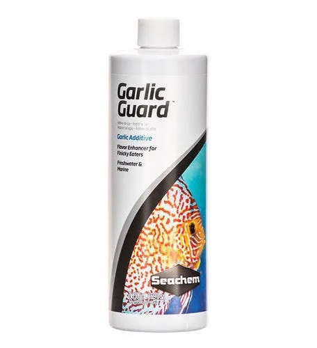 GarlicGuard™ is an all natural garlic scented odor and flavor enhancer for freshwater and saltwater fish. Our research has shown that many fish are attracted to natural odors, such as garlic. Simply mix GarlicGuard™ with any food item, such as Seachem’s NutriDiet® Flakes, to attract the interest of finicky eaters, e.g. discus and marine angelfish. GarlicGuard is safe for reef and planted aquariums.