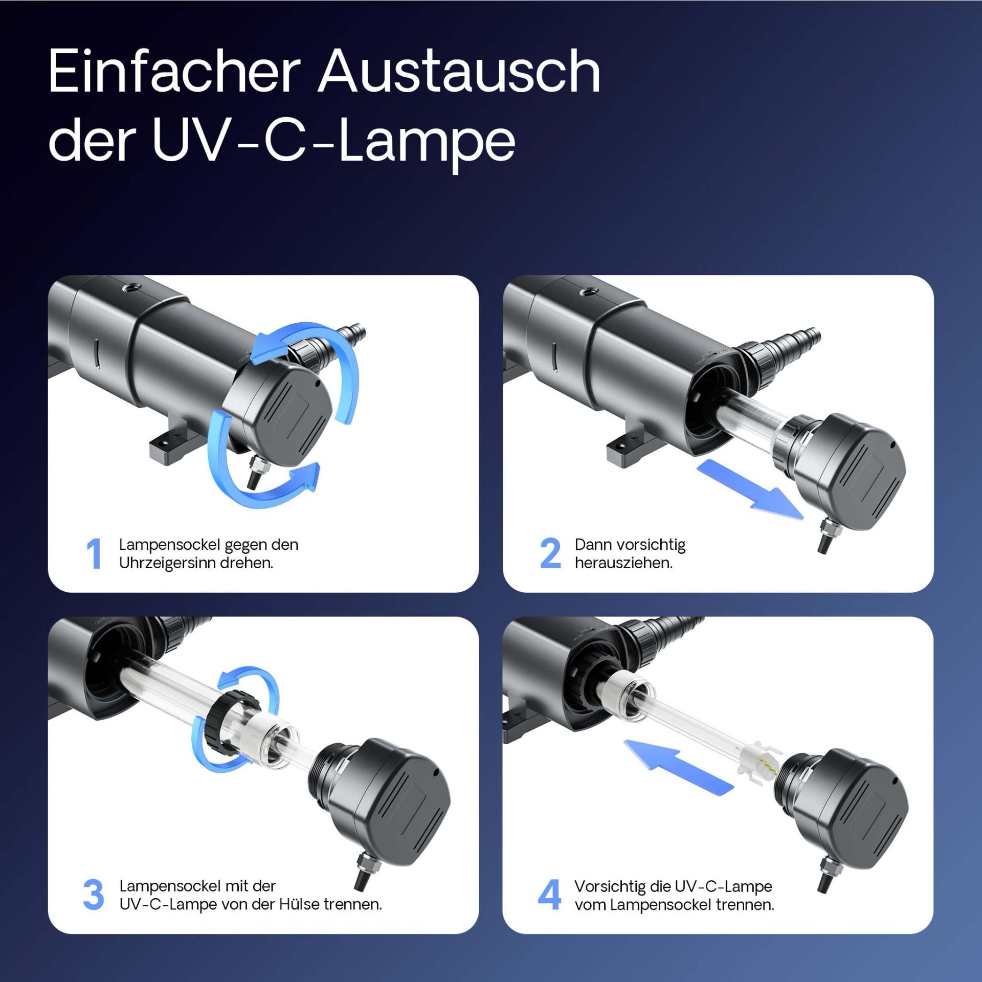 The life span of the UVC-light source varies between 7.000 and 10.000 operating hours. We recommend that you change the light source and clean the quartz glass of the UV lamp at the start of the season, when the water temperature of your pond rises. The flowing water is purged of harmful bacteria and germs. The reduction of germs has no negative effect on the microclimate of the pond because bacteria settle themselves on stones, the filtration surface, and in the whole pond system for reducing pollutants and they can reproduce themselves. The UV lamp can maintain the total microbial content of the water in near-natural proportions.