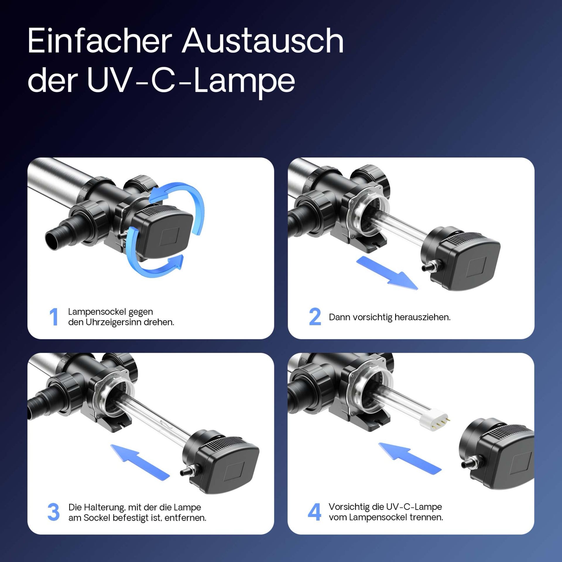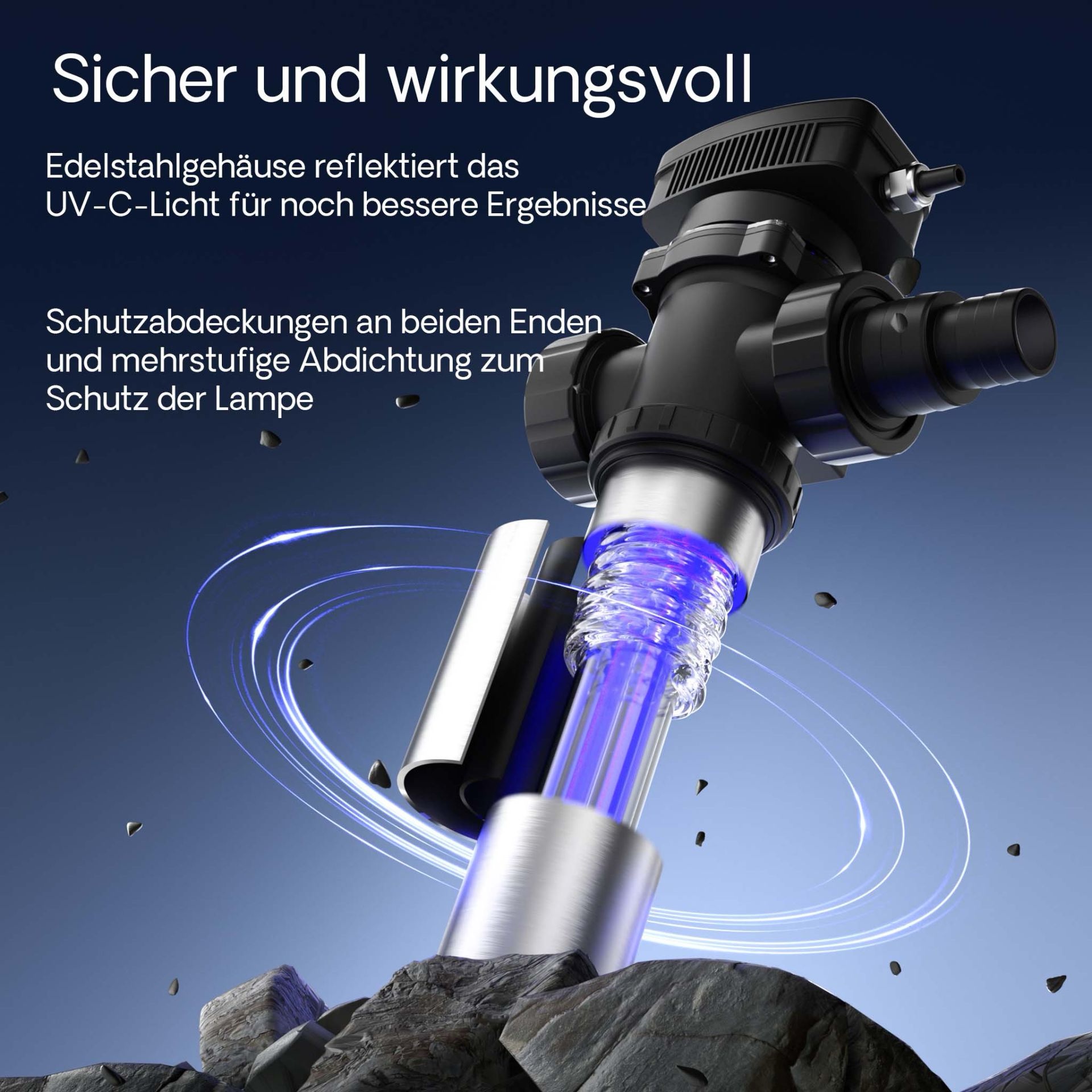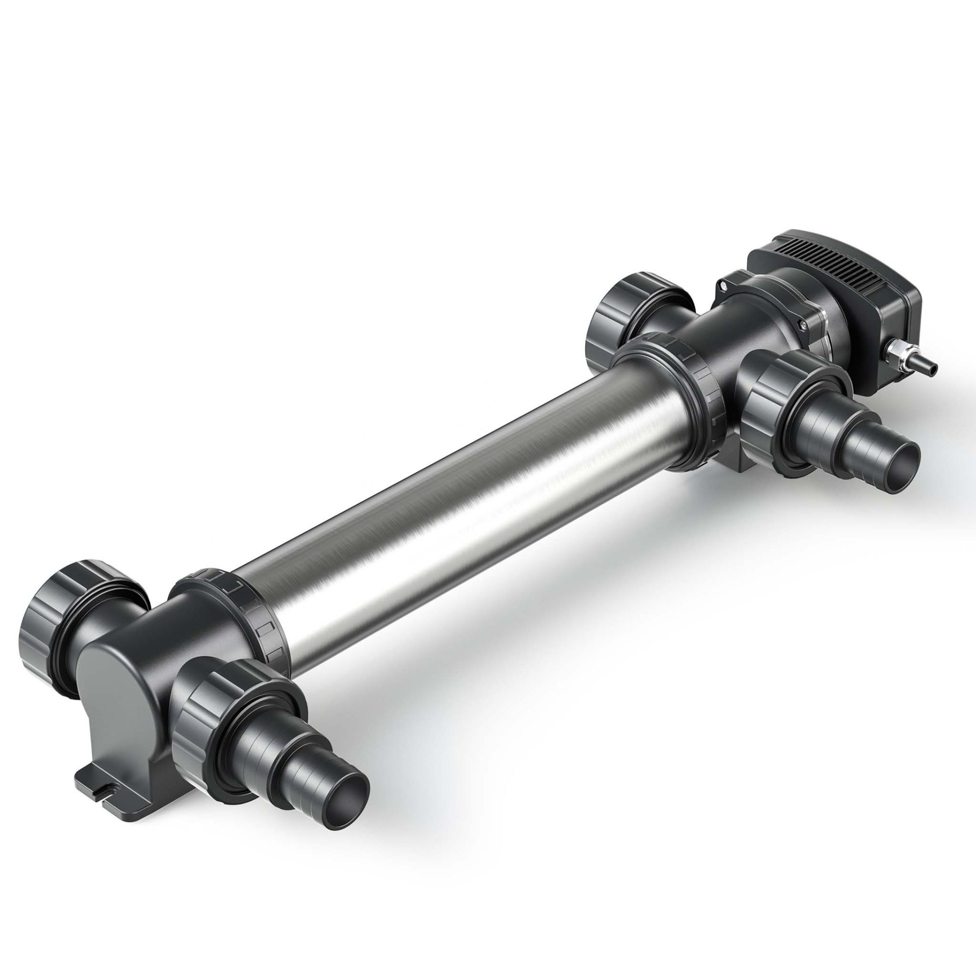 The water is also freed from harmful bacteria and germs. However, the germination reduction has no negative effect on the pond climate as bacteria can settle for the pollutant degradation on rocks, pond filter media, etc. in the entire pond system and can continue to multiply there. The UV lamp can maintain the total microbial content of the water in a healthy near-natural ratio. Mounting: