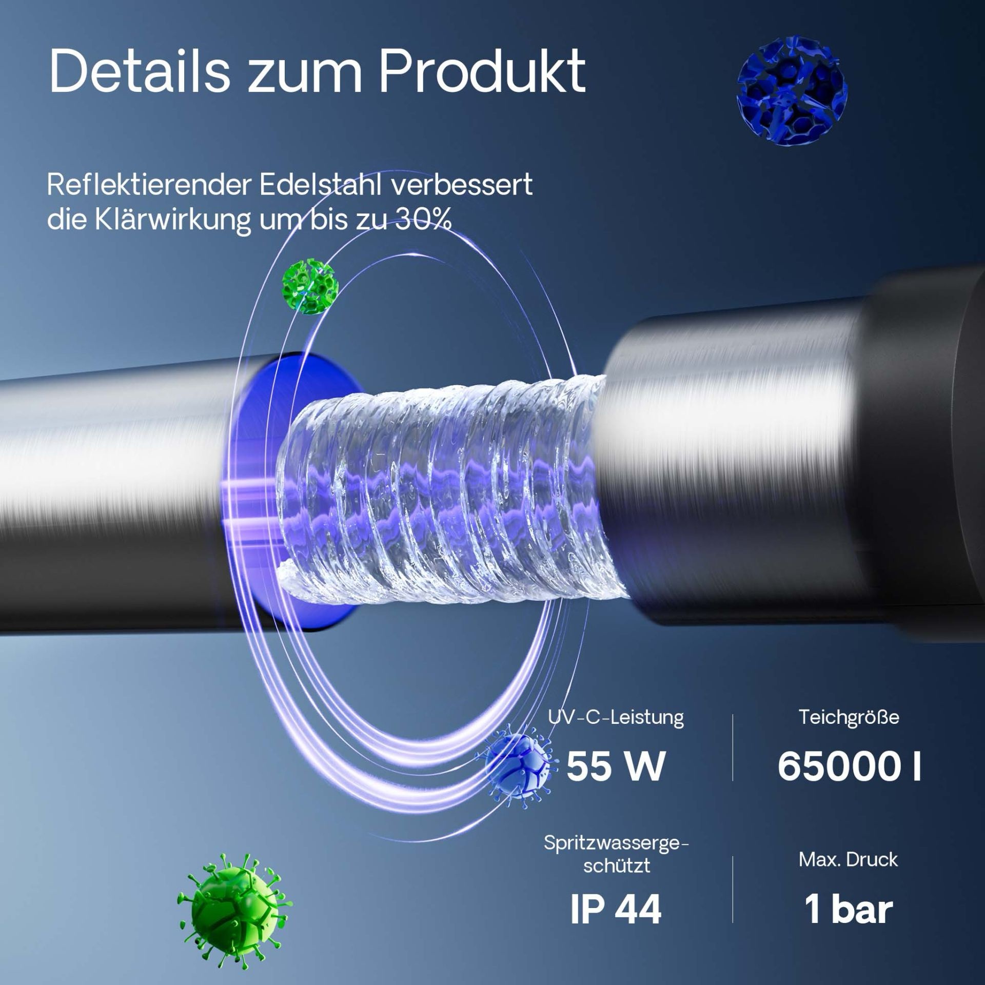 If there is a reason for assuming an increased microbial load, and if all other possibilities are exhausted, the permanent use of a UVC clarifier for reducing the germ count is urgently recommended. UV lamps are used to clarify pond water. Green suspended algae multiply very quickly when the pond water is exposed to organic pollution, and the pond water turns green. Especially in the spring when the temperatures rise and the time when the sun is shining increases this leads to a strong and often undesirable visual impairment in the garden pond.